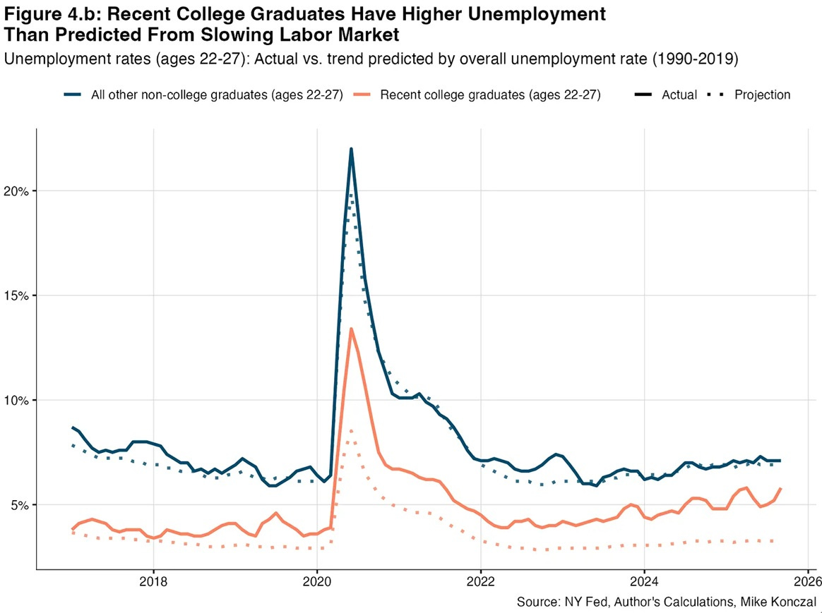 To be clear: college-educated unemployment is still lower than non-college unemployment, and everyone’s unemployment is up…What’s unusual is the gap between where college unemployment should be historically and where it actually is today…[Y]oung people have higher unemployment than we’d expect at 4.4% overall unemployment. It’s especially higher at its peak and throughout their 20s for people with a college degree. Their recent unemployment rate is historically a surprise. The bad kind of surprise.