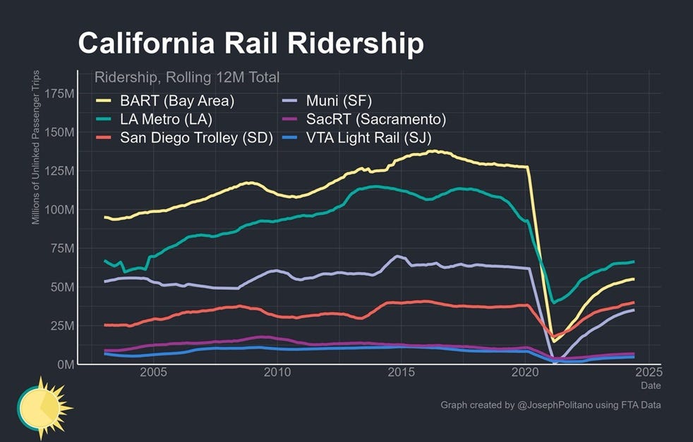 The Bay Area Rapid Transit system (BART) is in a parlous state. Ridership has plummeted in recent years; it did not even come close to fully bouncing back after the pandemic.