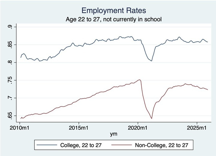 In fact, as Ozimek shows, recent college grads have shown pretty constant labor force participation (i.e. they’re all still trying to find jobs), while a number of non-college people of the same age have stopped looking entirely. This shows up as higher unemployment for the college grads, even though the gap in terms of “who has a job” has actually widened since the release of ChatGPT.