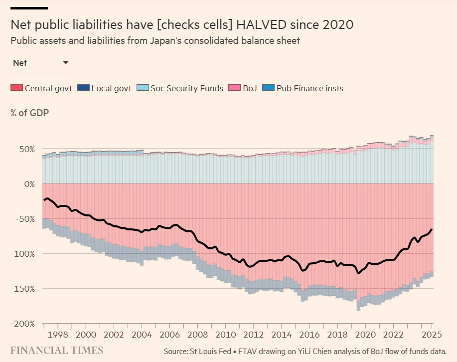 [I]f the Japanese government had raised a bazillion yen on the bond market and funnelled it all into, say, a successful forex trading operation and a long-only stock portfolio which has gone to the moon, maybe we should consider these assets too when trying to work out what sort of parlous state Japan is actually in?…