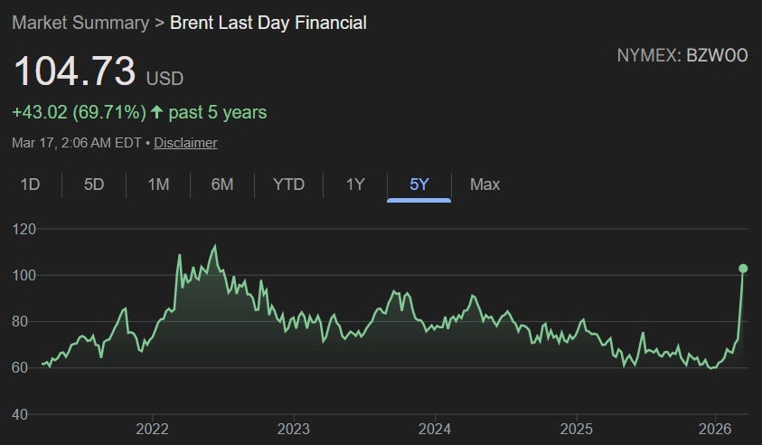 The Iran War is making everyone afraid to go through the Strait of Hormuz — the key maritime choke point that a significant part of the world’s oil must pass through in order to reach the world market. Iranian strikes and mines have effectively closed the strait, and European countries are refusing to help America reopen it (which is perhaps only natural, given Trump’s threats to seize Greenland from Europe, and his withdrawal of aid from the Ukraine war). As a result, oil prices have skyrocketed: