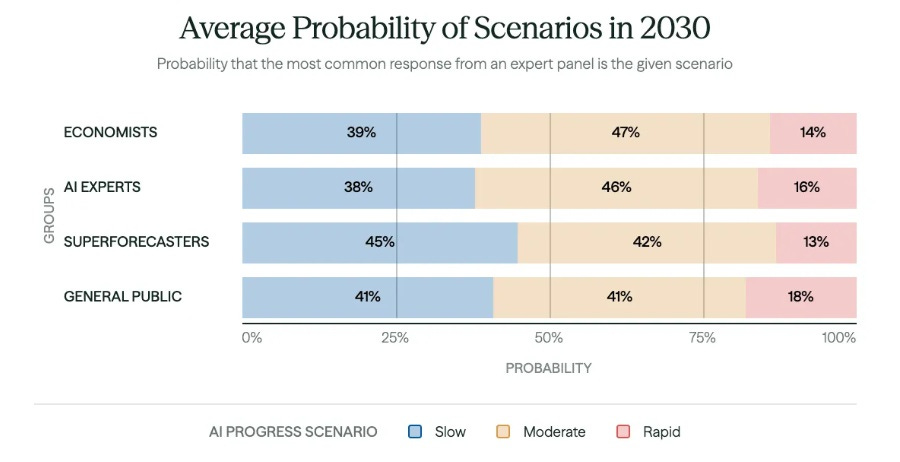 And yet of all the groups, only the AI experts predict a major growth acceleration in any of these scenarios — and even then, it’s only an acceleration to 4 or 5 percent, not to the 10 or 20 percent scenarios that some people have thrown around: