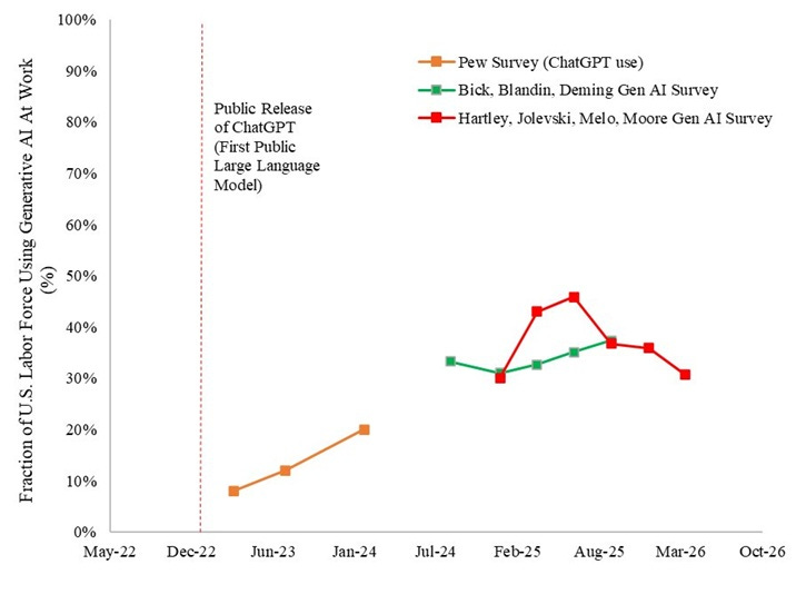 In fact, there are now a few such data points. Hartley et al. are maintaining an ongoing survey of American workers, in which they ask who’s using generative AI at work. For a while, their survey showed a rapid increase in adoption. But over the last year, they find that adoption has actually fallen:
