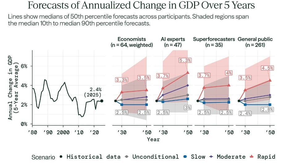 The economists' skepticism on AI growth might be the most interesting data point in this whole roundup. The gap between capability forecasts (where all groups agree) and economic impact forecasts (where they diverge) is basically telling us we're in the Solow Paradox again. Every GPT follows this pattern: impressive tech, bolted onto existing workflows, disappointing macro numbers, then decades of institutional redesign before the real payoff. I wrote a longer take here: https://noahpinionot.substack.com/p/you-can-see-ai-everywhere-except