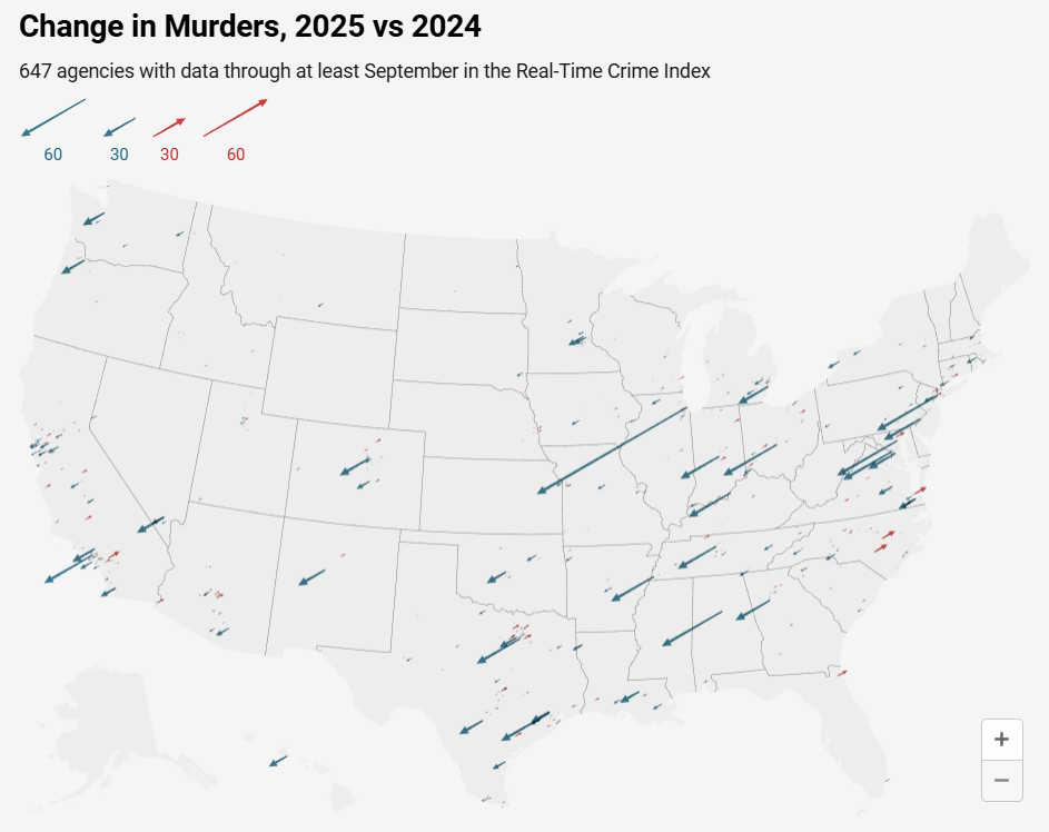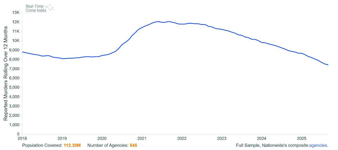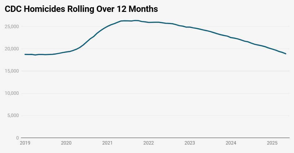 Most encouragingly, the drop appears to have continued, or even accelerated, in 2025. Murders are plunging in almost every big city: