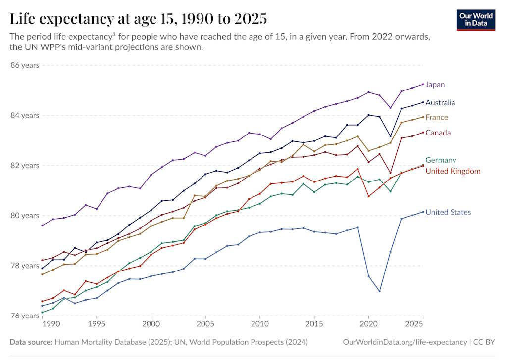 But I’m happy to report that this trend has now reversed! Not only has U.S. life expectancy more than bounced back from the pandemic, but the negative trend of the 2010s seems to be over as well. The gap with other rich countries remains, but the U.S. is no longer falling further and further behind: