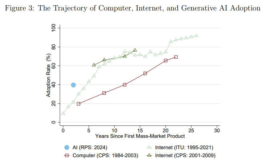 But I just don’t think this is going to happen to AI. Very few people use VR, even a decade after it started getting hyped. But AI is being adopted more rapidly than any technology in history. As far back as a year ago, 40% of people were already using AI at work: