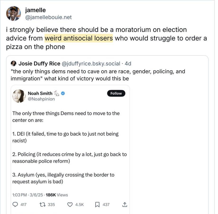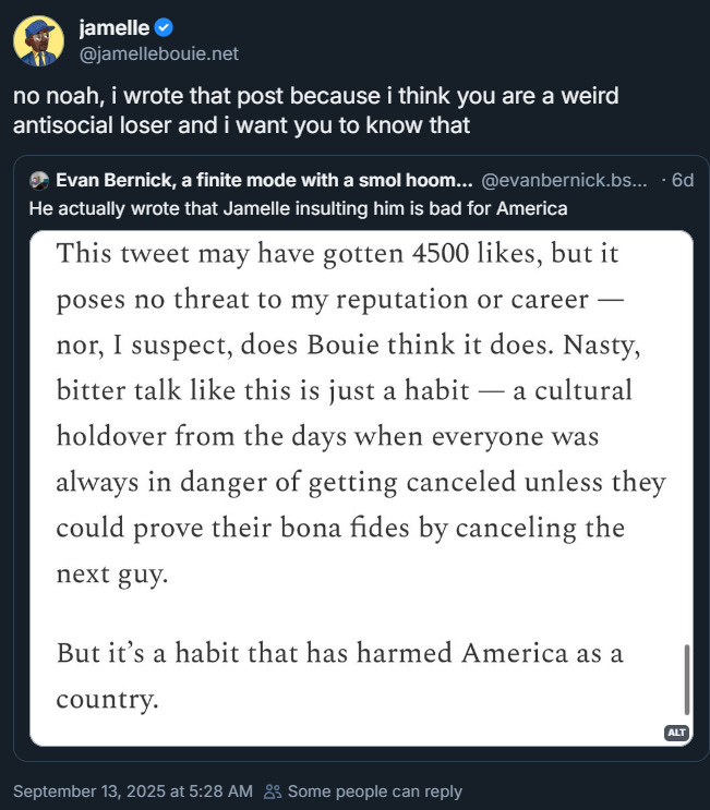 Whenever I read a criticism of my writing on Bluesky, it seems to be insubstantial and denunciatory, like this casual insult from New York Times writer Jamelle Bouie: