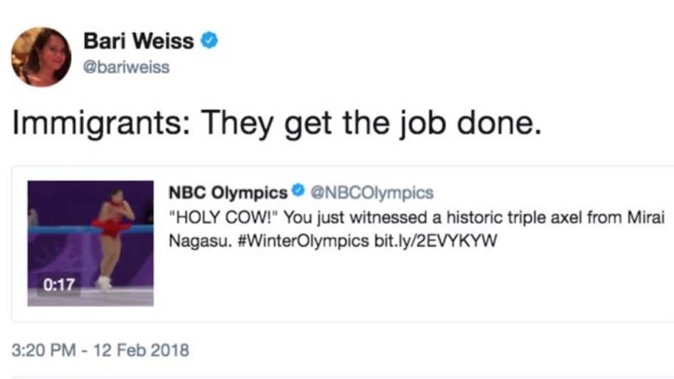 Back in 2018, Bari Weiss got dogpiled on Twitter for an anodyne liberal tweet. Weiss congratulated Olympic skater Mirai Nagasu on pulling off a difficult move, quoting a line from the musical Hamilton about immigrants being great: