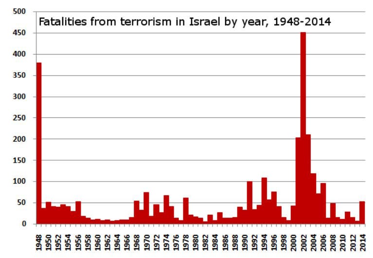 It sounded plausible, and I recall being pretty convinced of the thesis at the time. But it turned out to be wrong. Just a few years after that article was written, suicide terror in Israel subsided to a low level: