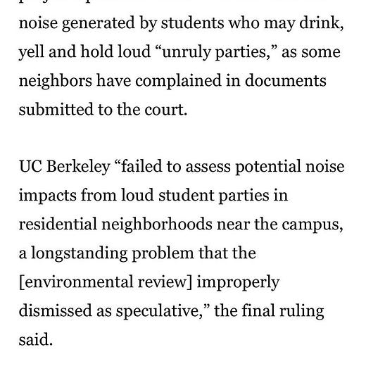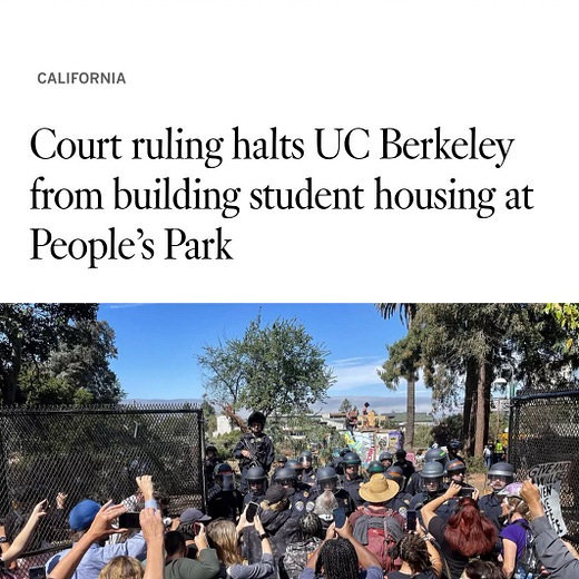 Ever day, new examples of this stasis pile up. In Berkeley, a plan to build student housing was just blocked by a court, which demanded that the university study whether students themselves constitute an environmental hazard. I wish I were kidding, but I’m not.