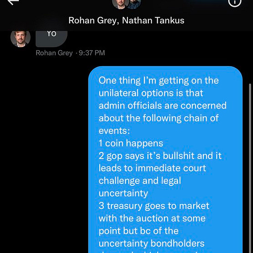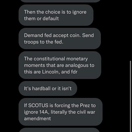 On top of that, debt ceiling brinksmanship just encourages even worse fiscal arsonists who are lurking out there in the margins of the political-economic discourse. The idea of minting a trillion-dollar platinum coin as a way to get around the debt ceiling is cute and fun, but some of the people pushing this idea are absolute maniacs. In a discussion with economics reporter Jeff Stein, two supporters of the idea proposed ignoring orders from the Supreme Court and sending troops to the Federal Reserve: