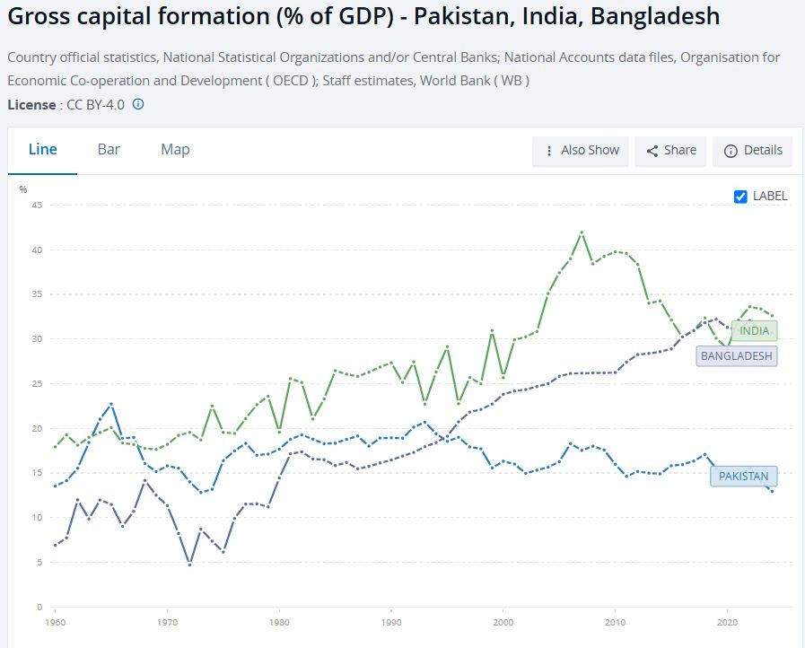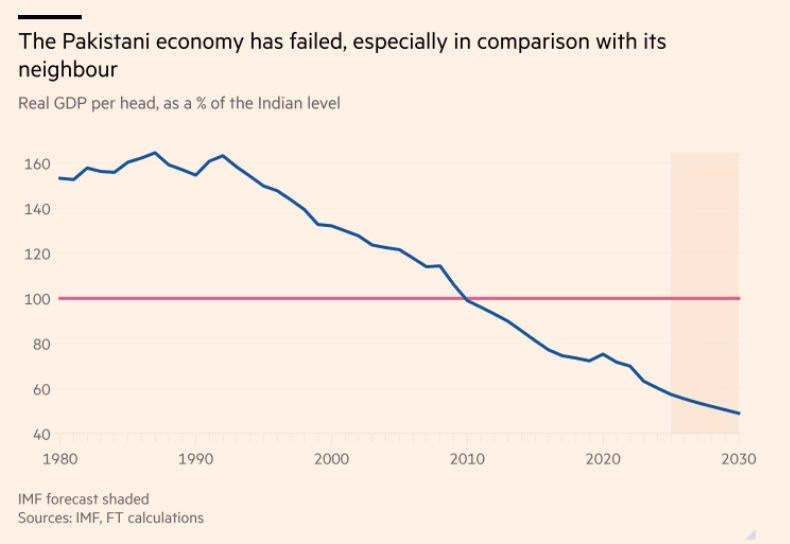 This infinite lifeline of free money acts a bit like oil does for a petrostate, allowing Pakistan to exist at a subsistence level without investing its savings or building up its industry much. While India and Bangladesh invest to grow their economies for the future, Pakistan fritters its money away on hanging on to an impoverished status quo: