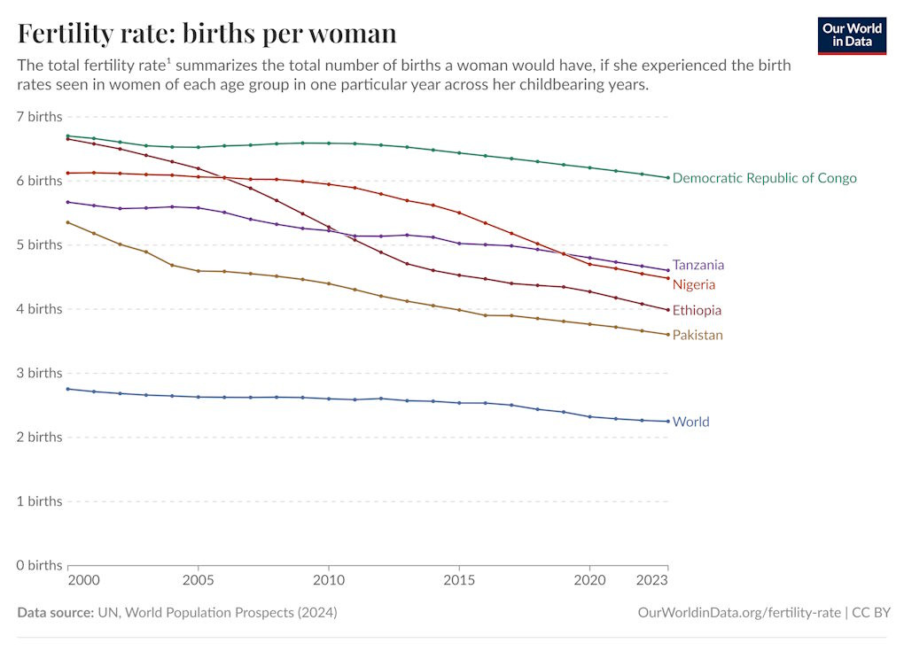 Of course we can expect to see the fertility transition accelerate as these countries cross the $7,000 threshold; as you can see on the chart, very few countries maintain high fertility past that level. But while Pakistan might manage that soon, the others probably won’t. Nigeria’s GDP per capita has actually gone down in recent years, Tanzania and Ethiopia are still decades away at current rates of growth, and the DRC is still seemingly inextricably mired in extreme poverty: