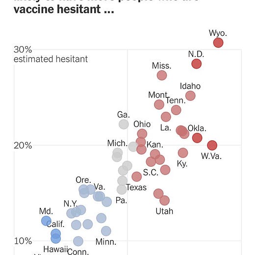 In other words, the pattern of resistance to the coronavirus vaccines looks less like COVID-19 vaccine hesitancy and more like COVID-19 denialism…[M]ost [vaccine refusers] come from the swath of the population that has tended to downplay the disease’s severity and to resist other measures to fight it, rather than the swaths that have resisted vaccines for other diseases.