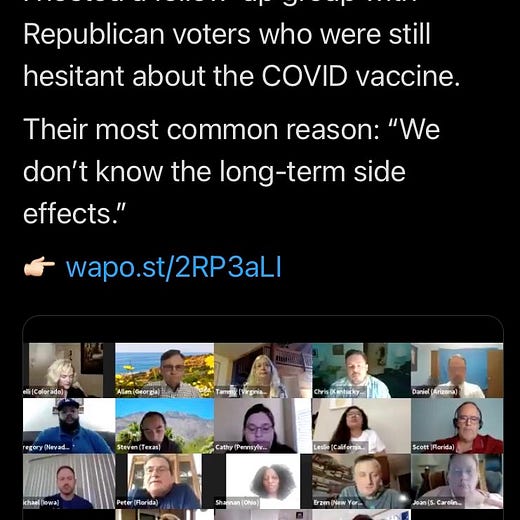 A 60 yo friend of mine who smokes regularly is hesitant. He hated Trump, enthusiastically voted for Biden. Worried about long term effects, years out. Says he will get it if his doctor gives it to him. Maybe getting more distribution through primary care docs would help?