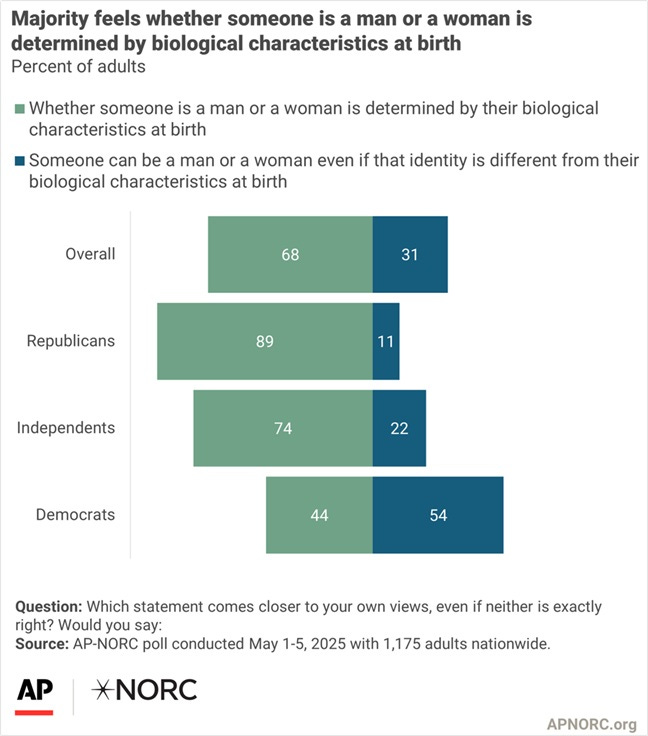A prime issue is trans rights. While 54% of Democrats say people are able to change their gender, 74% of Independents say gender is determined at birth: