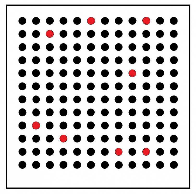 Here, every little square is a neighborhood. Every square without a red dot builds housing, and every square with a red dot blocks housing. As a result, housing gets built in half of the neighborhoods.
