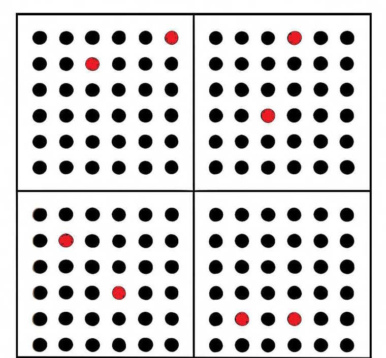 Here’s a schematic of what this looks like. Suppose a state is divided into four cities. Each dot represents a citizen, and each red dot represents a local NIMBY: