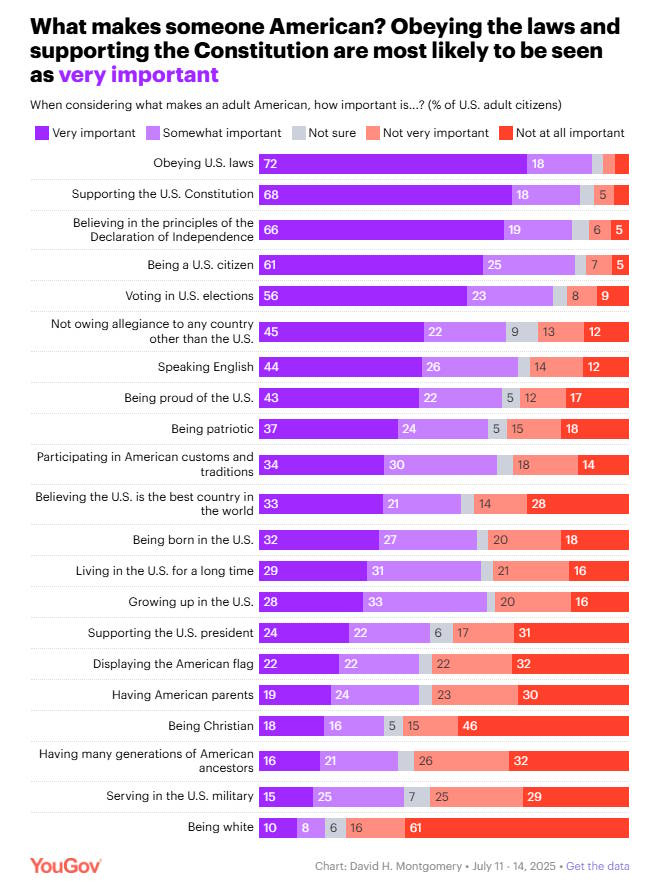 It’s important to recognize that all of these ideas are well outside of the mainstream. YouGov did a poll this summer asking Americans what makes someone an American. Most of the items at the top of the list were behaviors like obeying the law, voting, speaking English, and beliefs like supporting the Constitution and Declaration of Independence, not owing allegiance to other countries, and so on. Ethnicity, race, religion, and family history all scored at the bottom of the list: