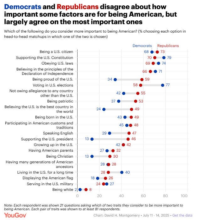 YouGov also asked a bunch of head-to-head matchups about which of these traits was more important, and the results came out basically the same. Furthermore, the partisan breakdown didn’t show particularly stark differences between Republicans and Democrats on who belongs: