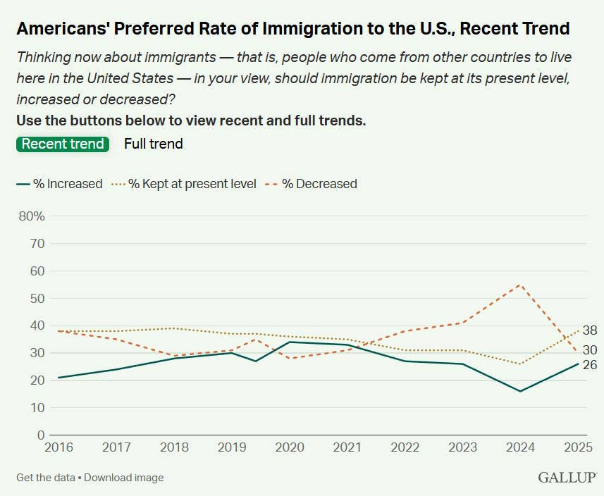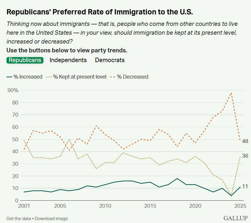 But this idea of immigration as an invasion, and deportation as a war, isn’t shared by the majority of Americans. Gallup has begun to see a major backlash against Trump’s anti-immigrant jihad. The fraction of Americans who wanted to decrease the rate of immigration soared under Biden, but has now plummeted back to where it was in Trump’s first term: