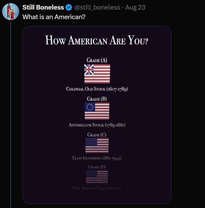 What’s interesting on this chart is that the author — who may or may not himself be American, but who is certainly doing a good job of riling Americans up on social media — doesn’t try to establish a hard and fast cutoff, but instead defines a system of grades, where the longer your ancestors were in the country, the more points you get.