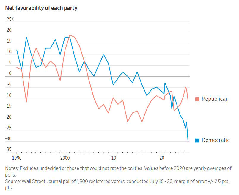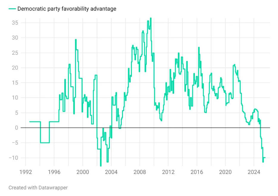 Yet despite this narrow ballot advantage, the Democrats are, if anything, viewed even less favorably than Trump. G. Elliott Morris’ poll aggregator has Dems looking more unpopular than they’ve been since the early years after 9/11: