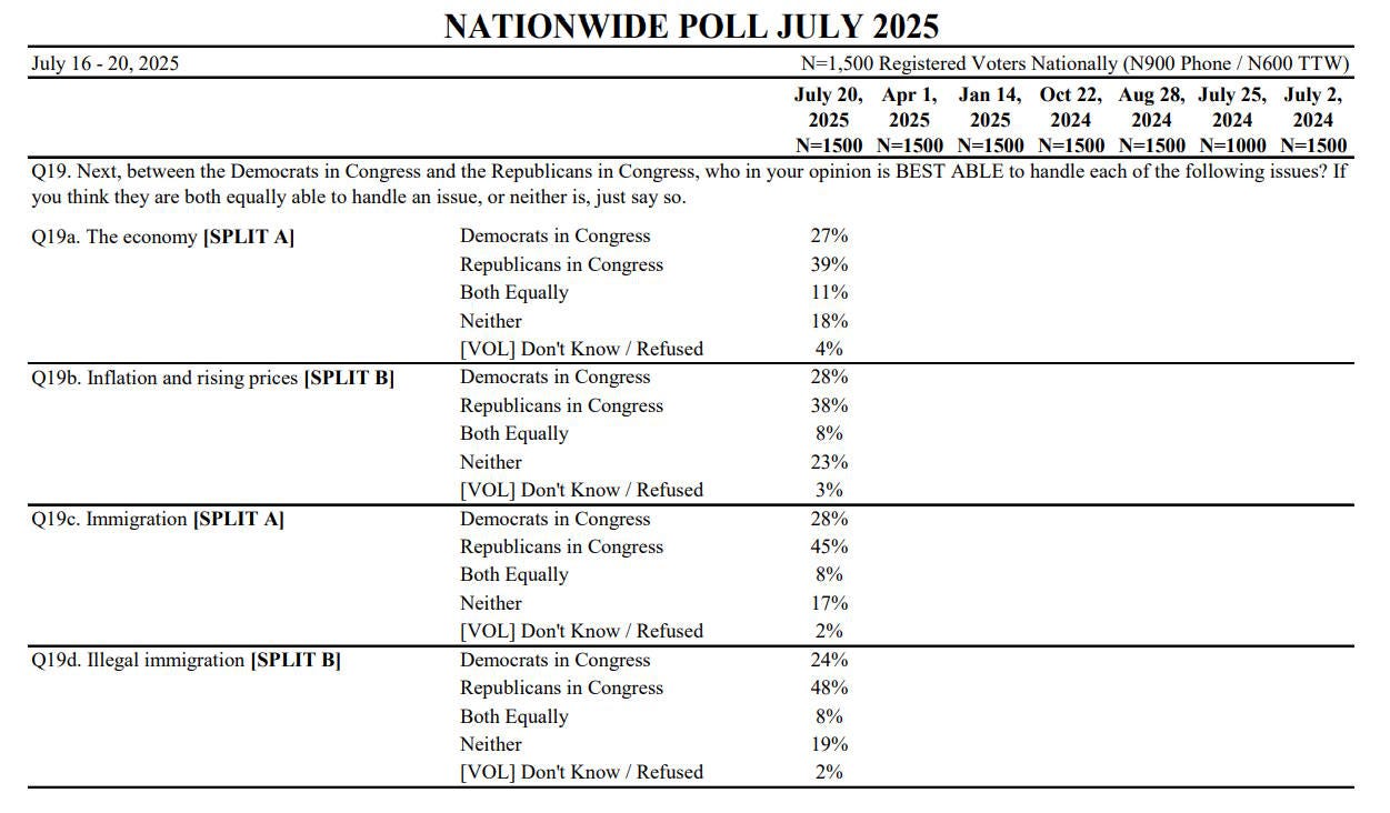 That’s highly unlikely to be the result of leftist defection from the Dems, since leftists are highly unlikely to endorse things like mass deportation or Trump’s strong support for Israel. Instead, the public’s preference for Congressional Republicans on the issues probably just reflects moderates who trust the GOP to do things that are more in alignment with what they want.