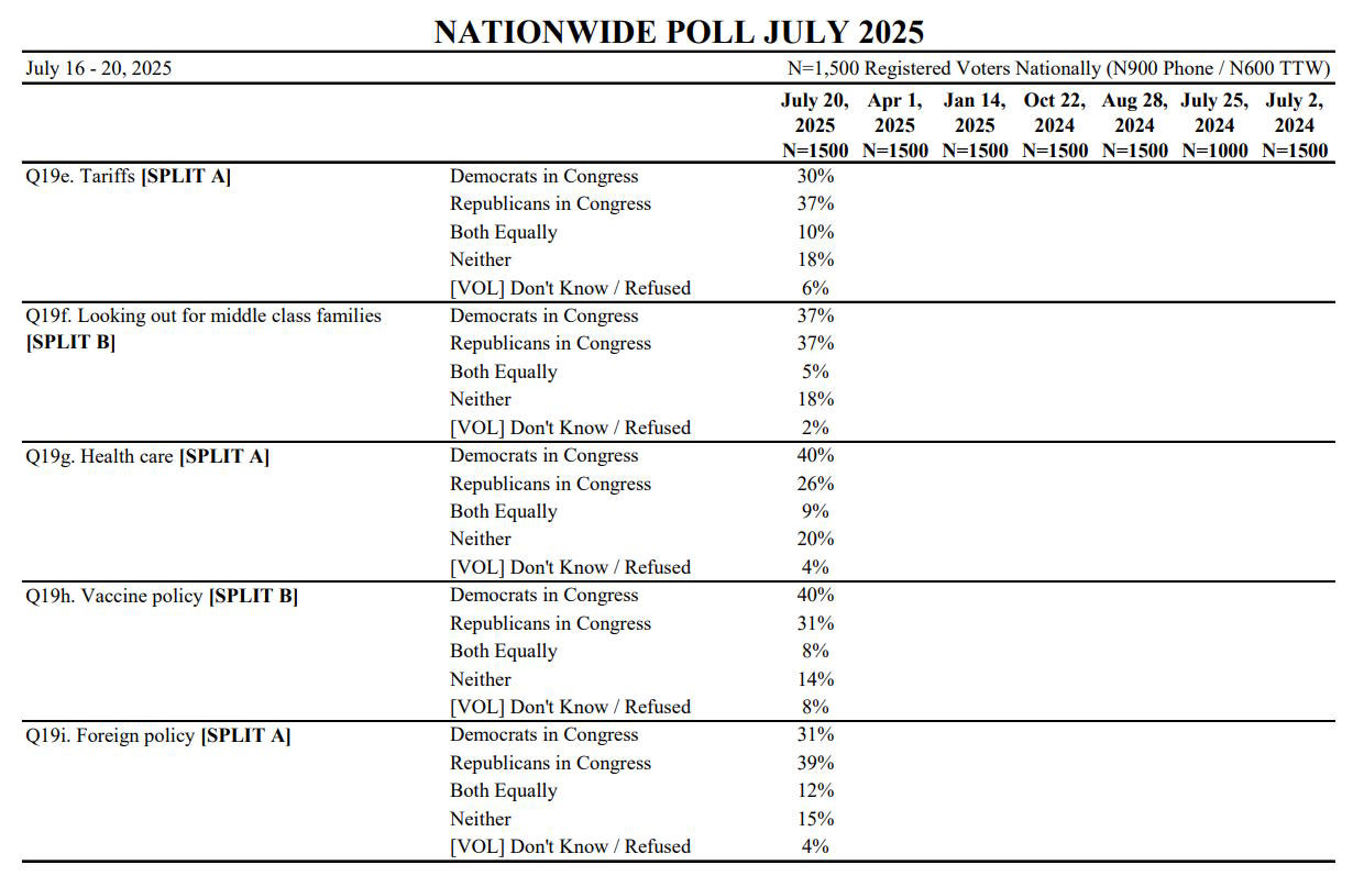 Democrats are still favored on health care and vaccines, but on all the big important issues — on the economy, inflation, immigration, foreign policy, and even tariffs — Americans say they trust Congressional Republicans more. The 17-point gap on immigration and the 24-point gap on illegal immigration are particularly galling, since they come despite the recent backlash against ICE and mass deportations.