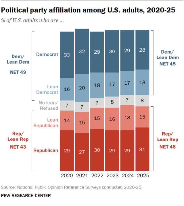 Then there’s party identification. A recent Pew survey shows how since the pandemic, fewer Americans are identifying as Democrats, even as more identify as Republicans: