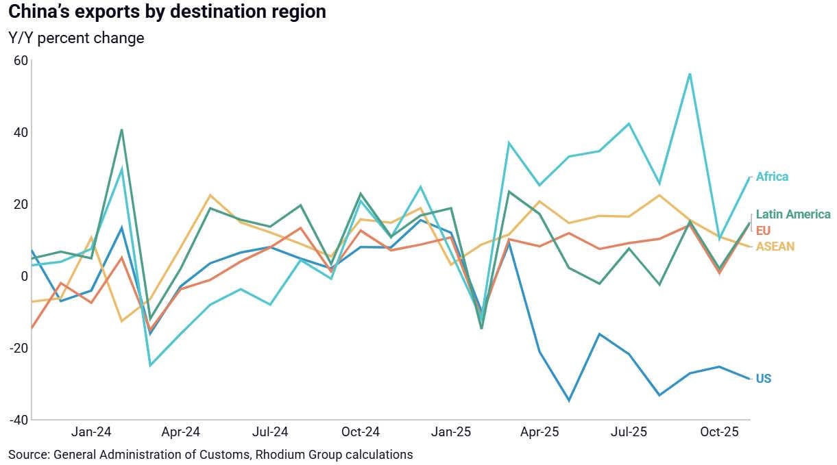 The second tailwind is Trump’s tariffs. Although Trump has backed off of most of his threats of tariffs on China, some important changes — like the end of the “de minimis” exemption for small packages — have gone into effect. And the threat of tariffs is probably prompting Chinese companies to seek other markets. As a result, Chinese exports to America are falling fast, while the country’s exports to other regions — Europe, Southeast Asia, and Latin America — are booming: