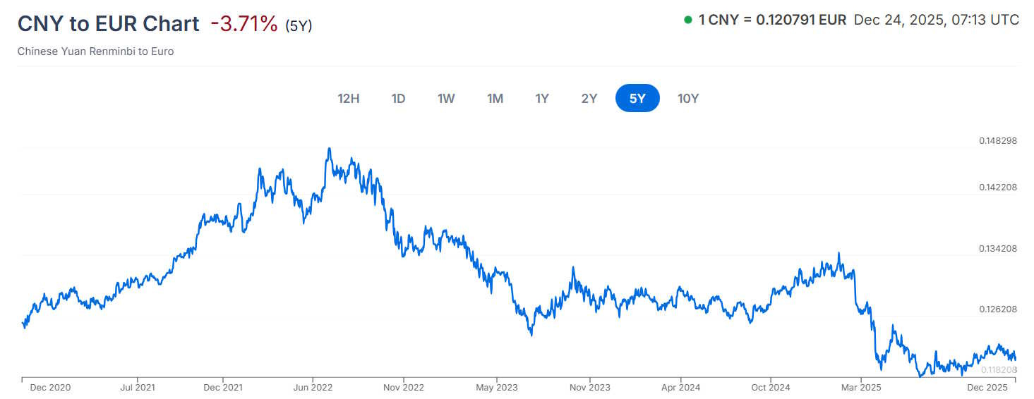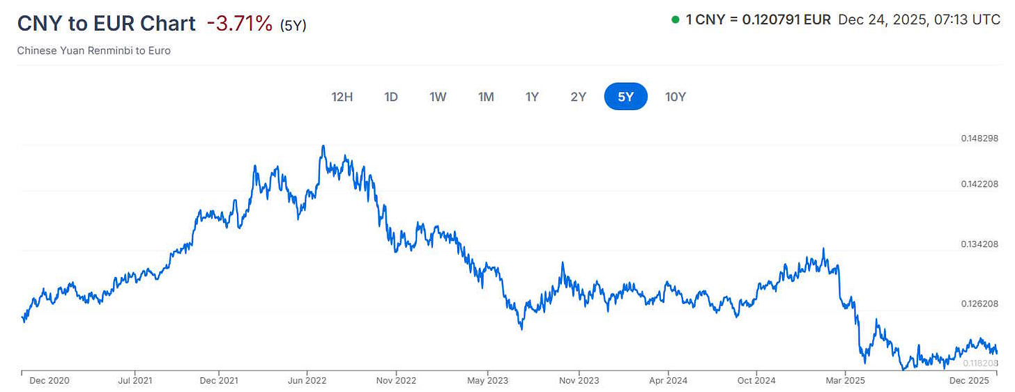 This flood of Chinese exports to Europe is being boosted by several tailwinds. First, China’s currency has gotten cheaper — partly as a result of China’s weak domestic economy, and partly because the government has pushed down the exchange rate in order to pump up exports. Shanghai Macro Strategist writes: