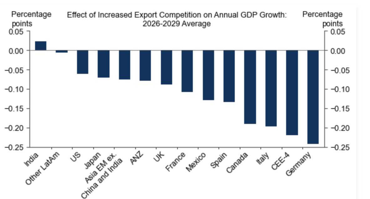 Fascinating and important report from Goldman Sachs. They have upgraded long-term GDP of China because of increased exports, but see this as reducing, not increasing, rest of world GDP. Chinese displacement of domestic manufacturing swamps any positives from cheaper goods…