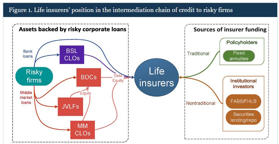 I’m not exactly sure how systemically important life insurance companies are; they’re intertwined with the rest of the financial system through a number of channels, and it’s hard to tell how significant those challenges are. But it seems like the possibility is there for some systemic effects. Meanwhile, other types of insurers are starting to lend to private credit as well. Remember that AIG, an insurance company, was one of the most important bailouts in the financial crisis of 2008.