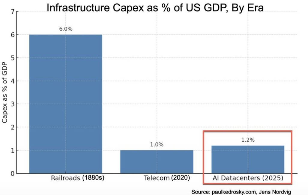 That would have been around 1.2% of U.S. GDP at the time — about where the data center boom is now. But the data center boom is still ramping up, and there’s no obvious reason to think 2025 is the peak, so Kedrosky’s point still stands.