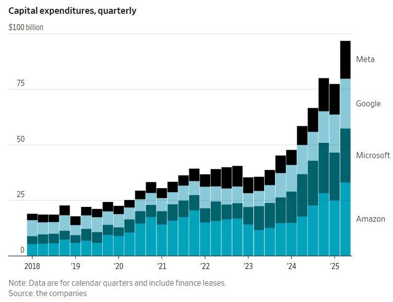 The Magnificent 7 tech firms have collectively spent a record $102.5 billion on capex in their most recent quarters, nearly all from Meta, Alphabet (Google), Microsoft and Amazon. (Apple, Nvidia and Tesla together contributed a mere $6.7 billion.)…