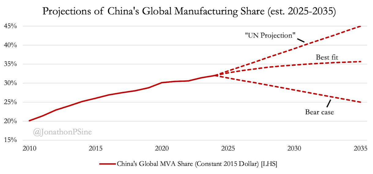 Note: I often post the UN’s forecast that China will account for 45% of all global manufacturing value added by 2030. But Jonathon P. Sine points out that 36% would be a more realistic projection: