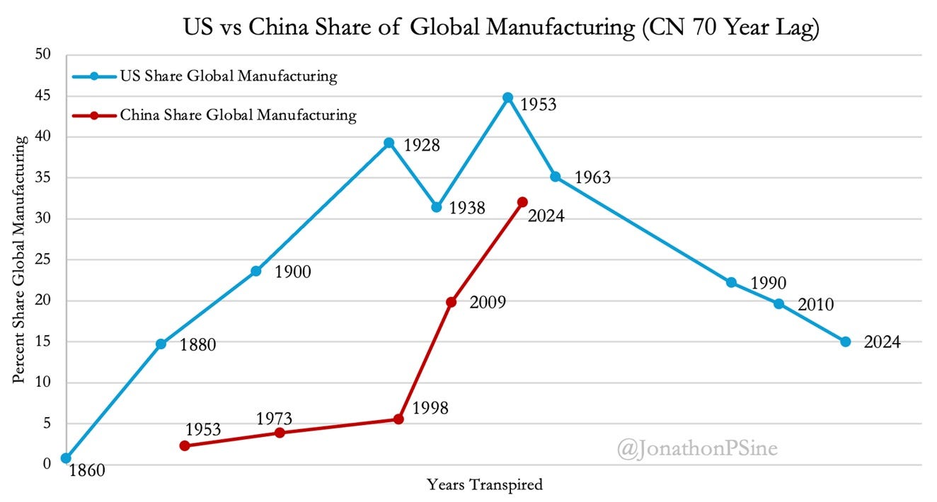 Meanwhile, China is reaching the zenith of its power. Its share of world manufacturing1 has rocketed up to levels similar to what the U.S. enjoyed in the mid-20th century, when it was the planet’s undisputed industrial colossus: